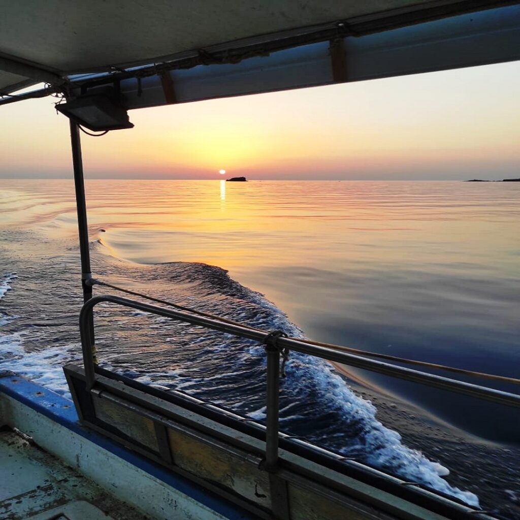 We leave Petra harbour at 6:00 PM. We will throw one of Mitsos’ fishing nets into the sea, which he will collect the next morning before the dolphins wake up. We can enjoy the breathtaking sunset while fishing with the rods available on board. Captain Mitsos serves some drinks on board.